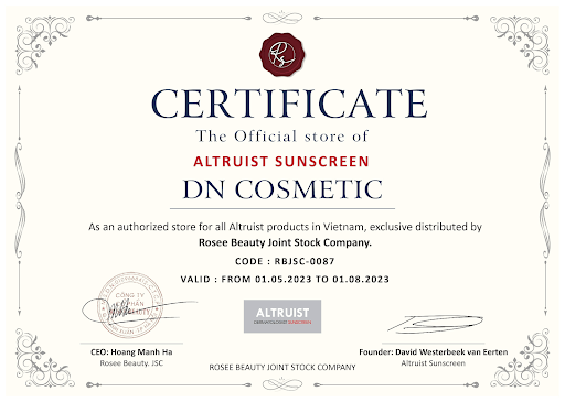 Altruist Vietnam xin gửi lời cảm ơn trân trọng tới các đối tác, NPP đã luôn tin tưởng và đồng hành cùng chúng tôi để thực hiện sứ mệnh giảm tỷ lệ mắc ung thư da thông qua việc nâng cao nhận thức về việc tăng cường sử dụng kem chống nắng chất lượng. Hè này, nếu ghé thăm thành phố Đà Nẵng, các bạn hãy tới DN Cosmetics để trải nghiệm sản phẩm Altruist Sunscreen ngay nhé!